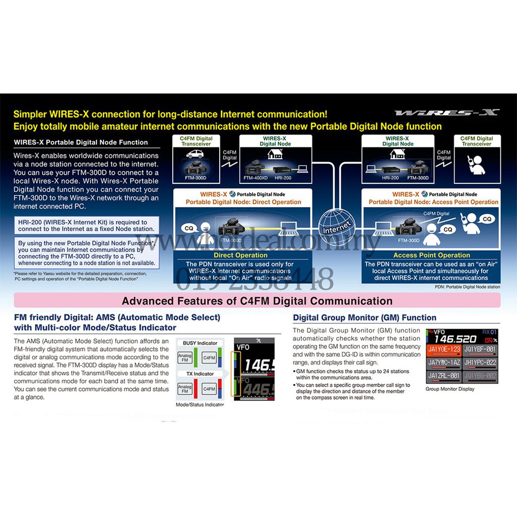 The FTM-300DR supports both the WiRES-X Portable Digital Node function and Fixed Node function with the HRI-200. Since simultaneous C4FM monitoring on both VFO A and VFO B is possible, users can enjoy both WiRES-X communications on one channel while monitoring another local channel at the same time.