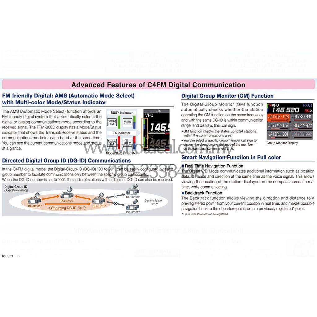 Memory Channel Band Auto Grouping (MBAG) is one of the advanced features of the FTM-300DR. Memory channels are automatically categorized in each band, and memory channels can be easily and quickly recalled by 4 Band Groups - Airband(M-AIR), VHF(M-VHF), UHF(M-UHF) and 174-400MHz/ 480-999.99MHz (M-GEN).