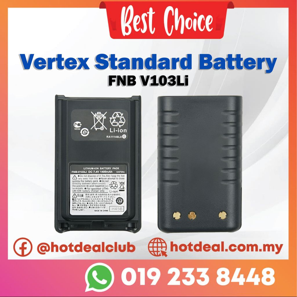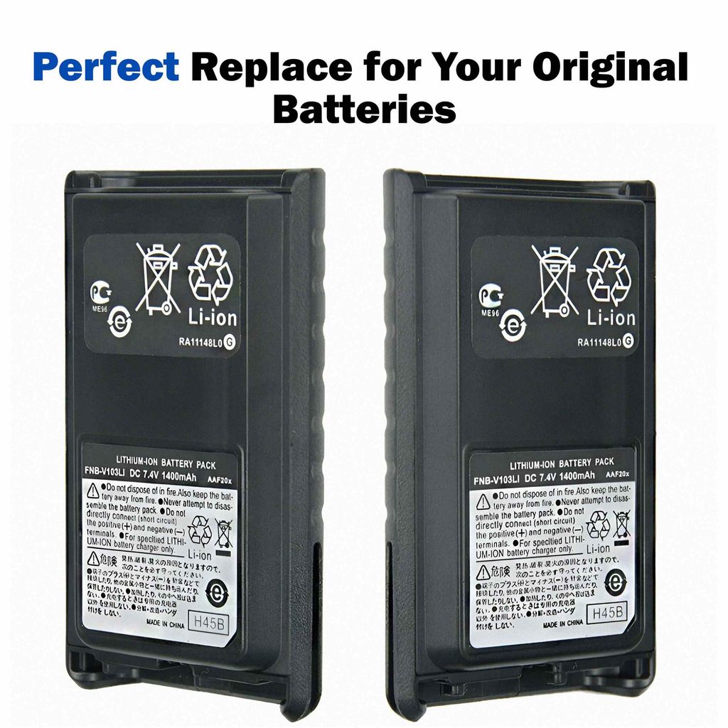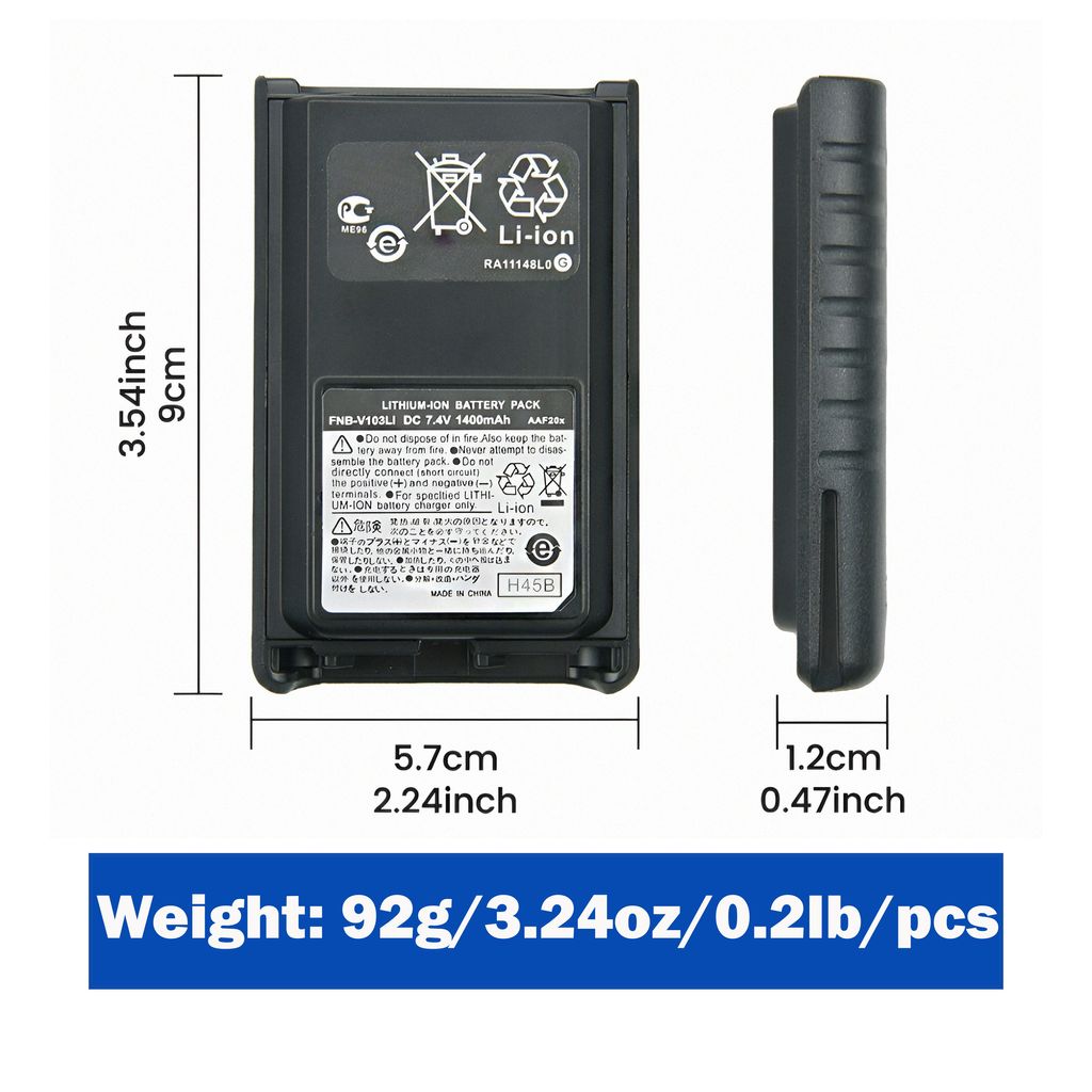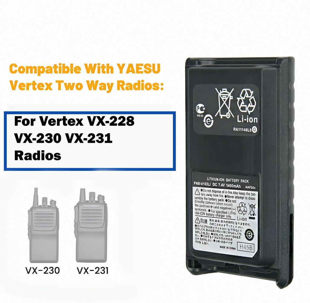 Vertex Standard Fnb-v103li Two Way Radio Replacement Battery Is Rated at 7.4v, 1380mAh. This Replacement Battery for Vertex Standard Vx-231 Walkie Talkie Is 100% Compatible and Will Meet or Exceeds Original Specification.