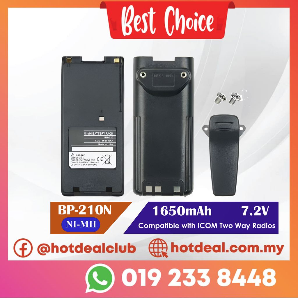 BP-210N (replaces BP-209N, BP-210N, & BP-211N ) for ICOM IC-A24 / IC-A6 etc. 7.2 volt 1650mAh ULTRA LONG LIFE BATTERY. Nickel Hydride battery pack. Includes screw-on Spring-loaded Belt Clip. Provides Hi-Watt Transmitting capability.