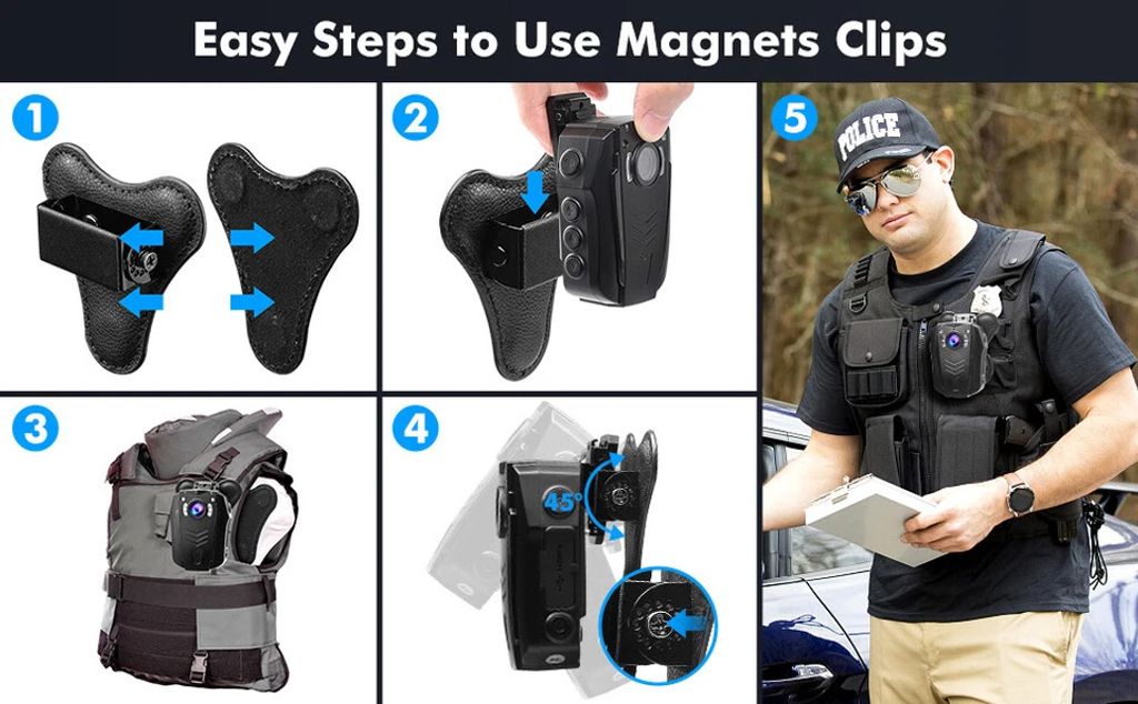 - 【How To Use the Magnetic Suction:】The clip with an adjustable plate is the "Outside" piece. Put the "inside" on the inside of the clothes and the "outside" on the outside of the clothes. The two pieces overlap at the same position and stay securely, and then insert the law enforcement device in the prominent gap. Adjust the angle of the clips to get a good view of police body camera. A slight vibration cannot make it fall.